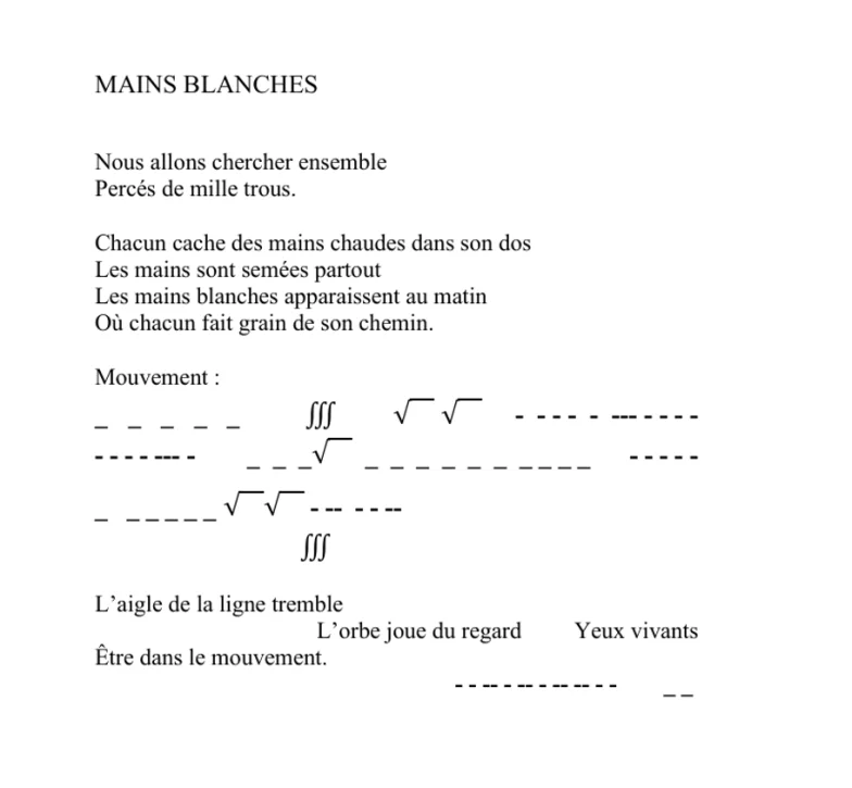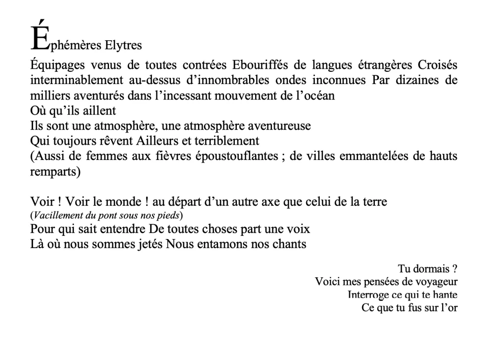 La typographie, qui peut sembler arbitraire ou anarchique, répond à un ordre précis, de nature organique. De même pour les caractères, qui sont de tailles variable. C'est une poésie qui n'a pas peur du vide, des coupes, des hésitations et vacillements. Et, s'il est beaucoup question d'assomptions charnelles, il y a aussi des percées et élévations purement verbales.