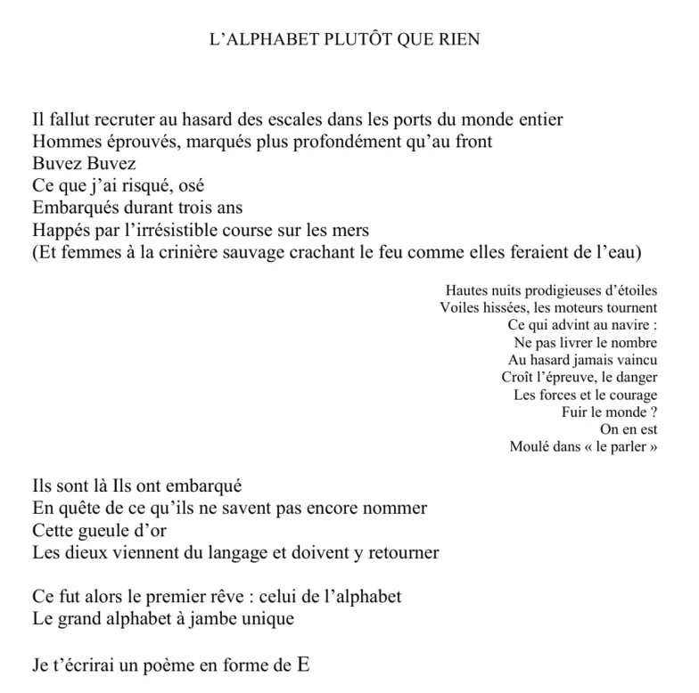 L’Alphabet plutôt que rien ou comment affronter la force d’un vertige dont le langage reste peut-être la seule voie de sortie. Des poèmes-étapes, des poèmes-franchissements dans une traversée chaotique vers la construction de soi, de l’amour et du langage. Formes brèves, formes longues alternent et se répondent en une musicalité proche du symphonique. L’alphabet dispose de l’espace et y éprouve ses rythmes.Lire l’article dans Le Matricule des anges par Richard Blin Je suis le rivage, poème de Constance Chlore. Partition d’Alain Bonardi pour vibraphone, tam-tam, piano et voix. Interprété le 31 mai 2011 au conservatoire de Vincennes, dans le cadre des Inouïs de Vincennes. Article de Bénédicte Heim, paru sur Livres addict