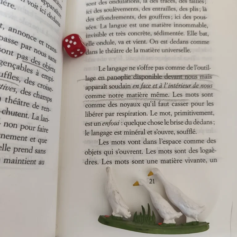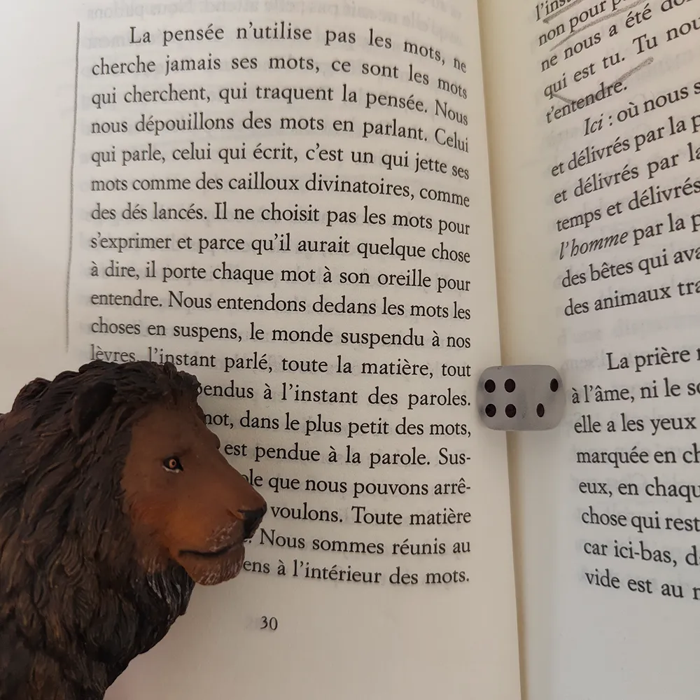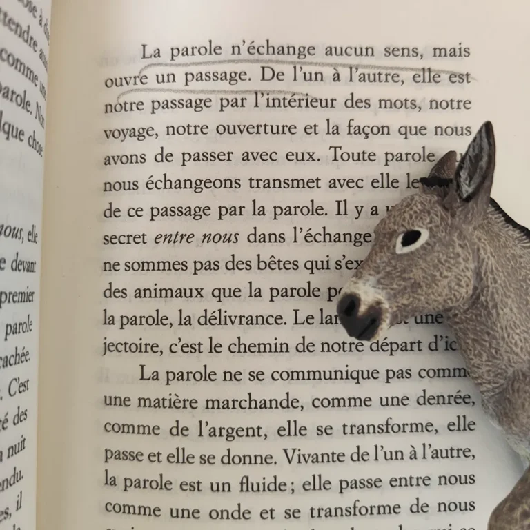 « La parole n’échange aucun sens, mais elle ouvre un passage », s’ouvre alors l’accès à nos animaux, soubassement même de la langue, et de sa rythmique. Cette simplicité de l’animal qui vit sous les choses met en mouvement la parole, nous décentre du « je » et de « l’homme ».